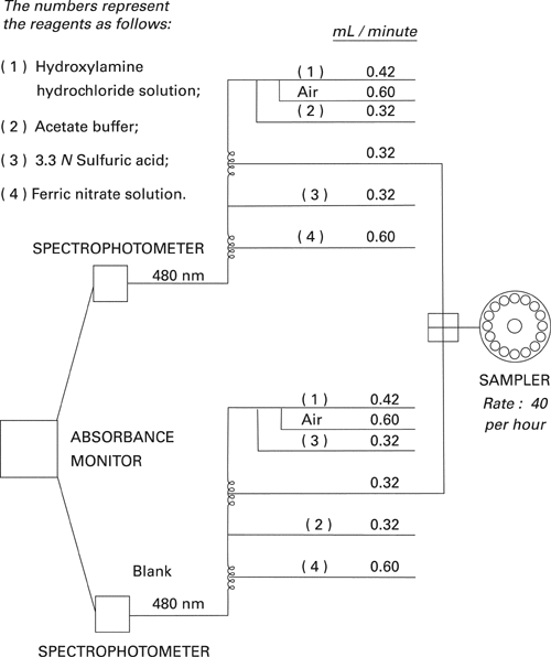 Automatic analyzer consisting of (1) a liquid sampler, (2) a proportioning pump, (3) a heating bath, (4) a suitable colorimeter equipped with a 2.0- × 50-mm flow cell and analysis capability at 420 nm, (5) a means of recording colorimetric readings, and (6) a manifold consisting of the components illustrated in the accompanying pertinent
