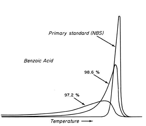 The basis of any calorimetric purity method is the relationship between the melting and freezing point depression, and the level of impurity. The melting of a compound is characterized by the absorption of latent heat of fusion, DHf, at a specific temperature, To. In theory, a melting transition for an absolutely pure crystalline compound should occur within an infinitely narrow range. A broadening of the melting range, due to impurities, provides a sensitive criterion of purity. The effect is apparent visually by examination of thermograms of specimens differing by a few tenths percent in impurity content. A material that is 99% pure is about 20% molten at 3 below the melting point of the pure material (see accompanying figure).